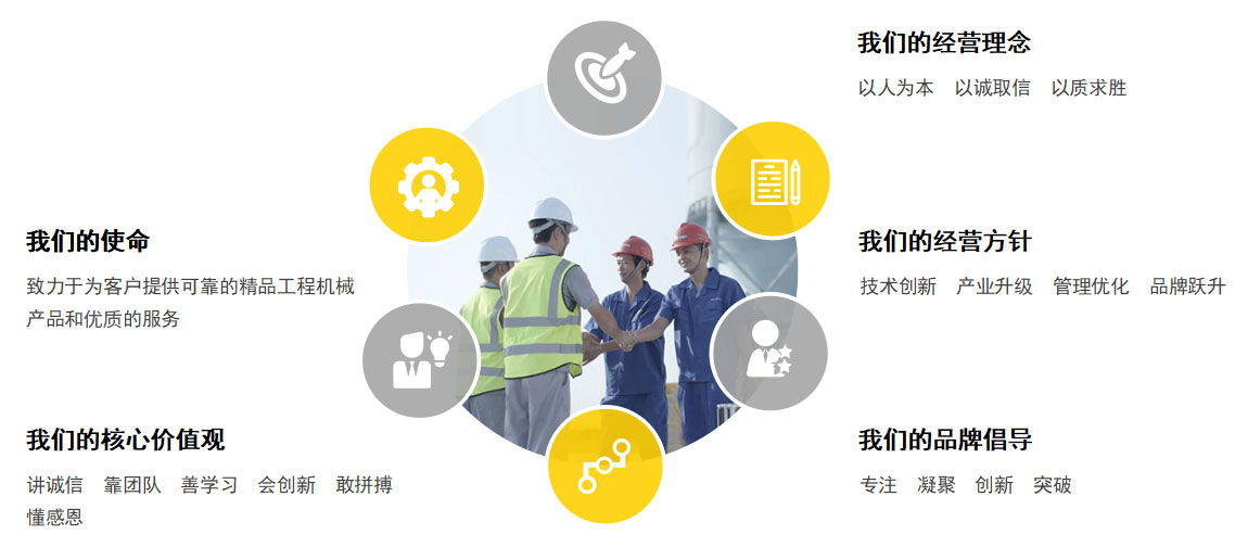 以员工、客户、合作伙伴为晋工发展之根本,坦诚相待、互信互利,实现与多方的和谐共生、共赢。在不断发展中自主创新,以客户的需求为晋工发展创新的源动力,不断推出性能优良、品质可靠的产品来赢得市场,也赢得更多客户的信赖。做精品,负责任,与第三世界国家的建设同步。做优秀的民族品牌。